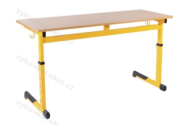 Změnit výšku školní lavice je možné bez použití nářadí. ROMEO FLEX dvoulavice výškově stavitelná s pracovní plochou vyrobenou z materiálu laminovaného MDF se zvýšenou odolností proti oděru s litou polyuretanovou hranou v přírodním bukovém dezénu má kovovou konstrukci tvořenou plochooválnými profily (50x30x2 mm) a jeklem (45x25x2 mm), jejíž povrch je upraven fosfátováním (chrání před korozí) a následně ošetřen práškovou vypalovanou barvou (komaxit). Po stranách ROMEO FLEX dvoulavice výškově stavitelné se nacházejí kovové háčky. Hrany jsou chráněny před poškozením systémem PUR (v nabídce také MDF a ABS). Nerovnost podlah lze vyřešit díky plastům s rektifikačními šrouby.