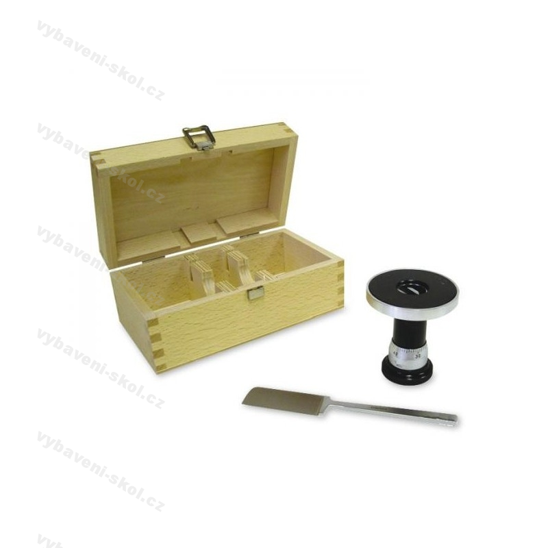 Mikrometrické dělení 0,01 mm (10 mikronů). Kompletováno plankonkávním nožem v dřevěné skříňce.