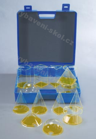 Troj-, čtyř- a osmi- boký jehlan, hranol. Krychle, koule, válec, pyramida, kužel, polokoule. Ruční výroba. V plastovém transportním kufříku.