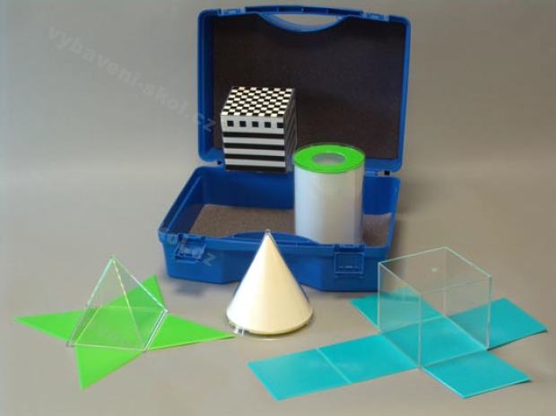Kužel, válec, krychle, čtyřboký jehlan, krychlový decimetr s vyznačenými centimetry krychlovými. Rozložitelné pláště. V plastovém kufříku. Ruční výroba.