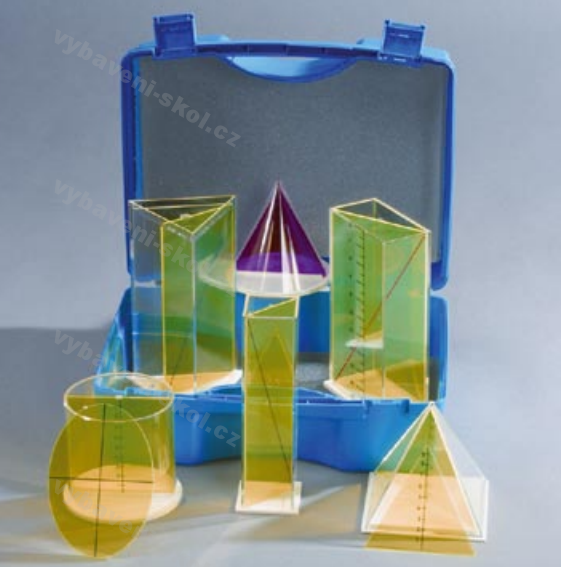 Kvádr, trojboký hranol, čtyřboký hranol a jehlan, kužel, válec. Ruční výroba. V plastovém kufříku.