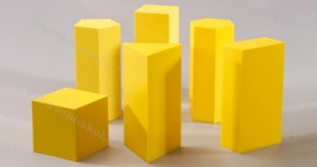 Troj-, čtyř-, pěti- a šestiboký hranol, kvádr, krychle. Ruční výroba. Žlutý plast. Popisovatelný povrch.
