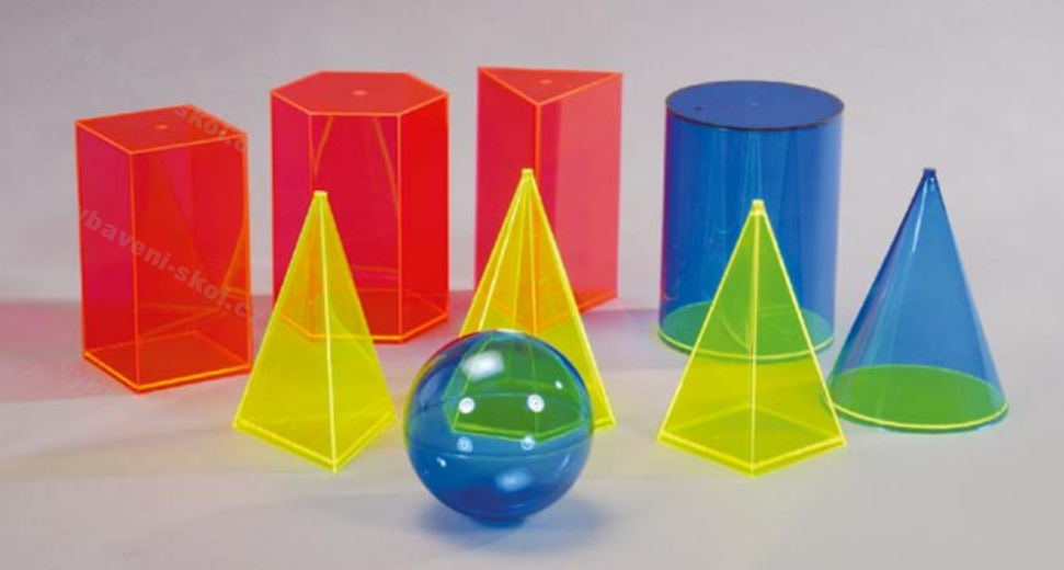 Troj-, čtyř- a šesti- boký hranol a jehlan, kužel, koule, válec. Ruční výroba. Barevné provedení.