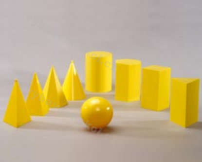 Troj-, čtyř- a šesti- boký hranol a jehlan, válec, kužel, koule. Ruční výroba. Žlutý plast. Popisovatelný povrch.