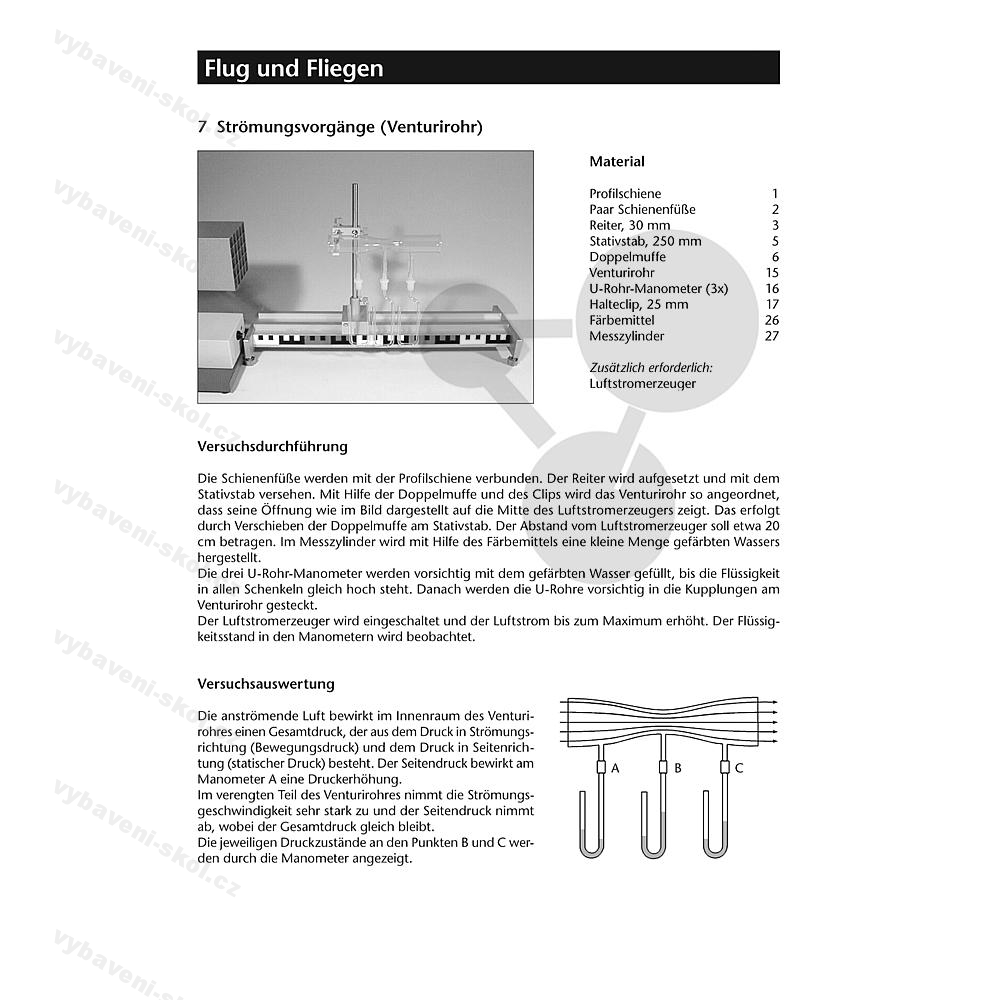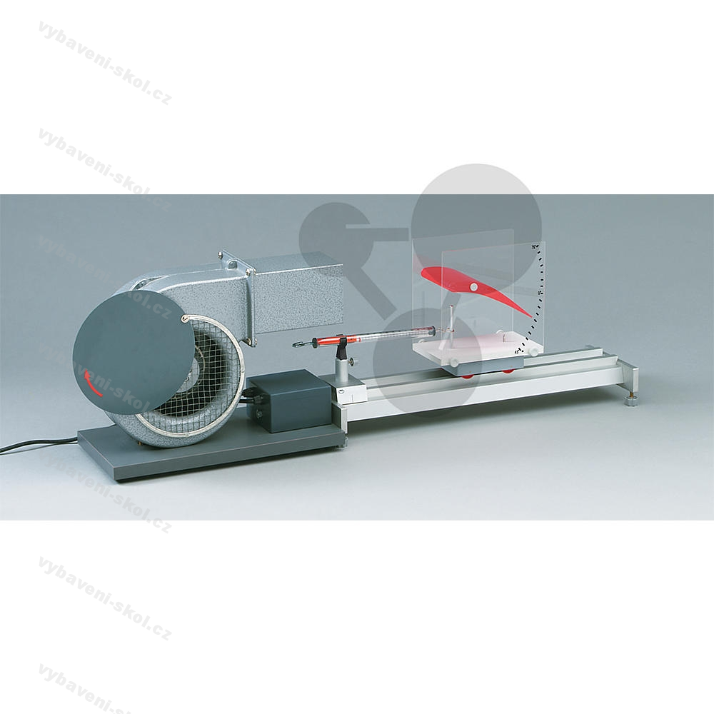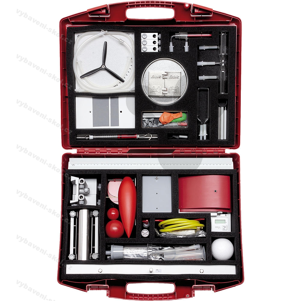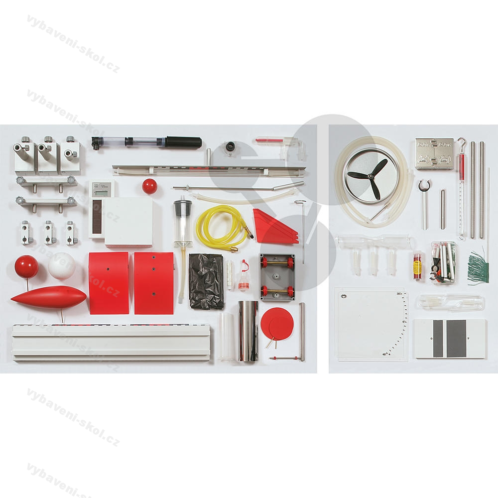 Složení: profilová kolejnice s nastavitelnými patkami a jezdci, stativový materiál, Pitotova trubice, Venturiho trubice, vrtule s držákem, praporek na měření vzdušných proudů, model vztlaku pro nosnou plochu s váhou, model nosné plochy s tlakovou měřicí sondou, vztlakový šikmý trubicový manometr, barvicí prostředky, sada těles na odpor vzduchu s váhami, siloměr, model rakety s hustilkou, horkovzdušný balón s hořákem, nafukovací balóny s ventilem, návod k provádění pokusů, kniha „Létání a křídlo“, plastový kufr