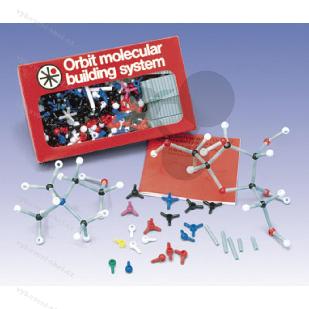 Stavebnice obsahuje 255 atomů, měřítko 3 cm = 100 pm. Barvy jader označují prvky, valenční úhly jsou vyznačeny. Vazby mezi atomy se skládají z plastových slámek, které lze přistřihnout na libovolnou délku.