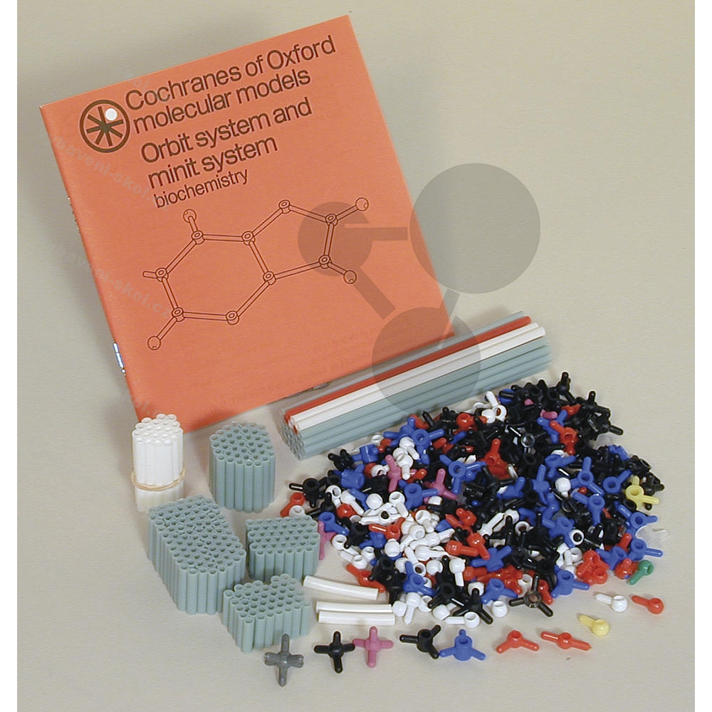 Stavebnice obsahuje více než 260 atomů, měřítko 2 cm = 100 pm. Barvy jader označují prvky, valenční úhly jsou vyznačeny. Vazby mezi atomy se skládají z plastových slámek, které lze přistřihnout na libovolnou délku.