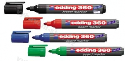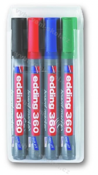 Sada plnitelných fixů popisovačů Edding 360 obsahuje 4 základní barvy: černou, červenou, modrou a zelenou. Popisovače jsou základním doplňkem flipchartu, nástěnky či tabule s bílým povrchem. Popisovací fixy jsou vhodné pro psaní, značení, zvýrazňování hladkých povrchů z materiálu (email, melamin, sklo, ad.). Jsou dobře viditelné a čitelné, snadno se stírají za sucha, jsou odolné vůči světlu. Rychleschnoucí popisovače Edding 360 mají hrot o průměru 1,5 - 3 mm, možnost výměny opotřebovaných špiček. Plastový obal fixů obsahuje kvalitní náplň a systém Cap-off zabraňující vysychání fixů při otevřeném hrotu (i několik dní). Bez přídavku butylacetátu. Náplň lze doplňovat, náhradní inkousty v nabídce (BTK 25). V odkaze stažení souborů naleznete návod k plnění popisovačů inkoustem.
