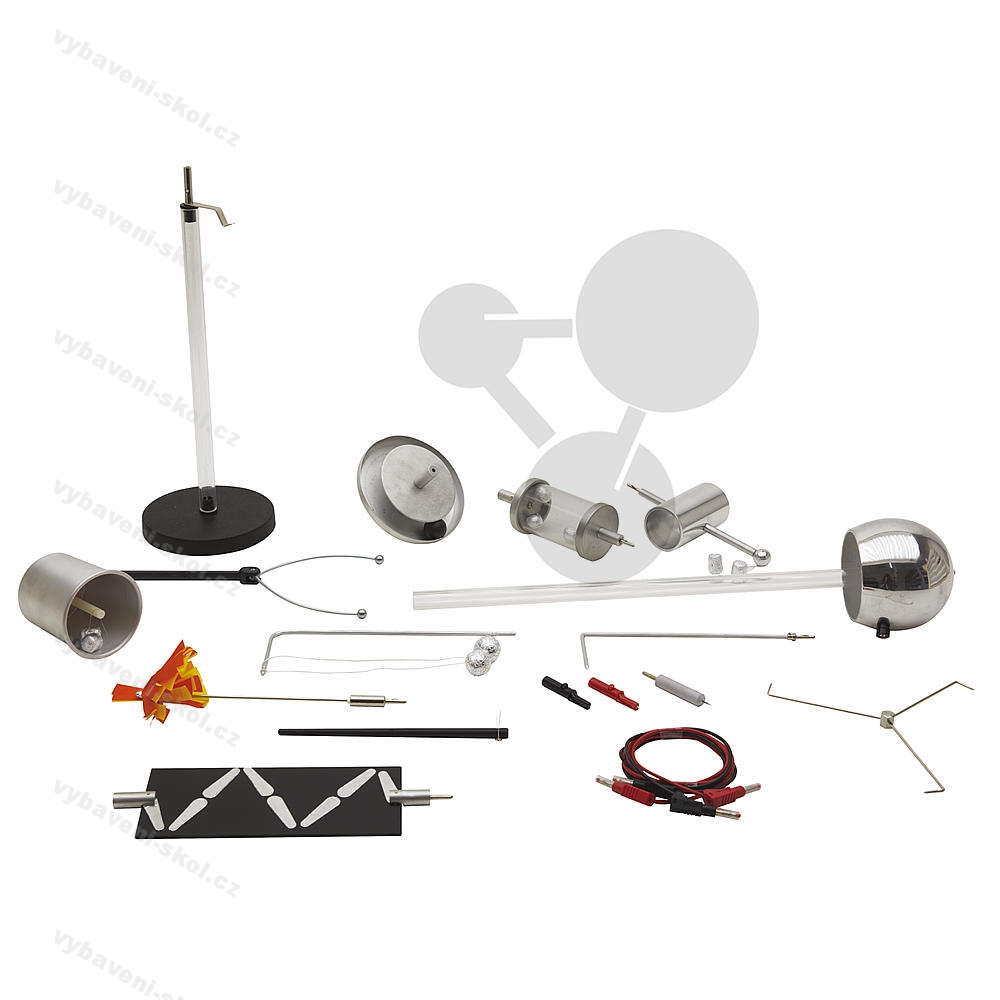 Pokusy pro zkoumání elektrostatických jevů, např. pro elektroskop, vybití přes hroty, elektrostatická dráha pro kouli, působení síly mezi nabitými tělesy (dvojité kyvadlo).