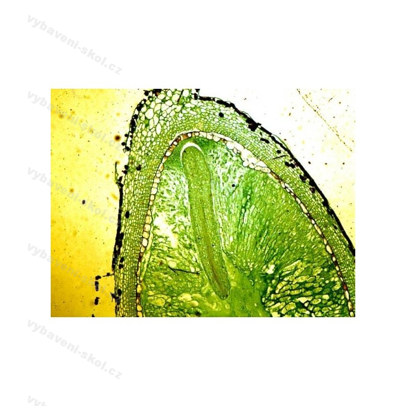 10 preparátů KONUS. Např. nálevník trepka, vláknitá sladkovodní zelená řasa, plíseň chleba s podhoubím a výtrusy, řez kůží s péry slepice, příčný řez kořene slunečnice, listem ptačího zobu. V krabičce, náhradní krycí a podložní skla.