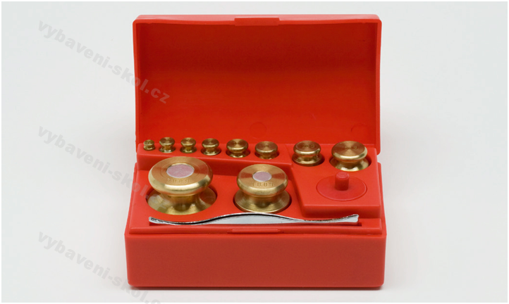 Mosazná závaží s pinzetou v plastové krabičce. Obsahuje závaží: