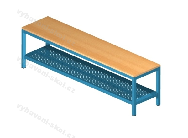 Šatní lavička z jäklového profilu, sedací plocha je vyrobená z laminátové dřevotřískové desky BUK o síle 18 mm s ABS hranou, odkládací rošt z perforovaného plechu.