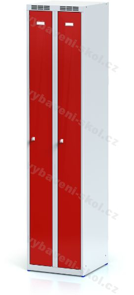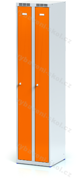 Skříň šatní dvoudílná s dvouplášťovými dveřmi, šíře odd. 300 mm, počet odd. 2, v oddělení 270 mm od víka police, tyč s plastovými. háčky. Rozměr: 180x60x50 cm (VxŠxH).