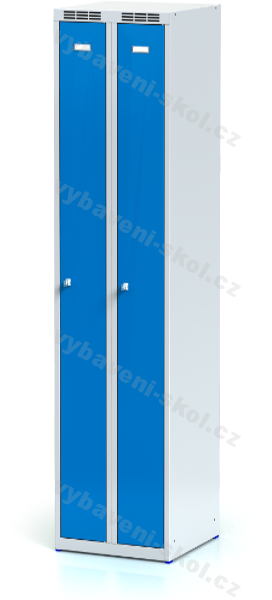 Skříň šatní dvoudílná s jednoplášťovými dveřmi, šíře odd. 300 mm, počet odd. 2, v oddělení 270 mm od víka police, tyč se plastovými háčky. Rozměr: 180x60x50 cm (VxŠxH).