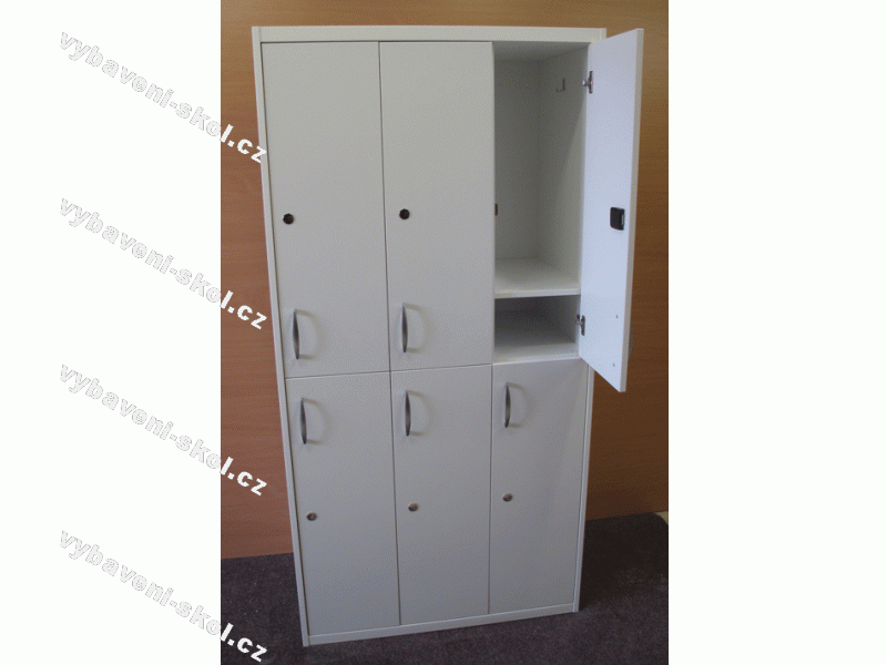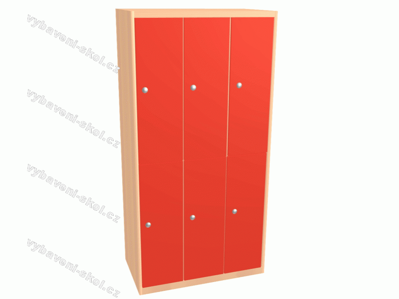 Třídílná dřevěná šatní skříň s 6 úložnými schránkami s policí a háčkem. Vyznačuje se stabilní konstrukcí (pevné kolíkové spojení a zdvojená laminová deska půdy a dna - 36 mm) a odolnými hranami (2 mm ABS systém na namáhaných částech skříně). Šatní skříň je vybavena rektifikací, která řeší nerovnost podlah (až do výše 2 cm) a kováním značky BLUM s doživotní zárukou. Záda skříně barva bílá. Barvu dvířek a typ zámku vybírejte ze vzorníku. Rozměry 180x90x50 cm (V x Š x H).