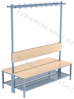 Šatní stěna je vyrobena z jäklových profilů s povrchovou úpravou komaxit, sedací plocha a opěradla jsou vyrobeny z laminátového dřevotřískového materiálu buk o síle 18 mm s ABS hranou. Rošty na boty jsou z perforovaného plechu, na odkládaní šatstva jsou bezpečnostní dvojháčky 9 ks. Výška sezení 42 cm, hloubka sedu 35 cm.