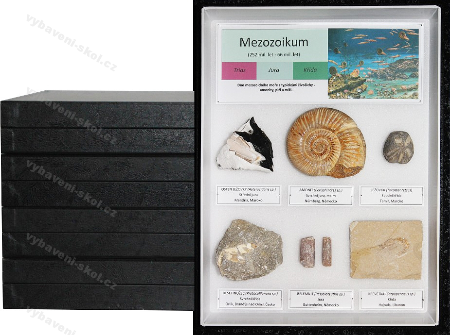 1) KRABICE - Prvohory moře: trilobit, graptolit, mlži, koráli, orthoceras.