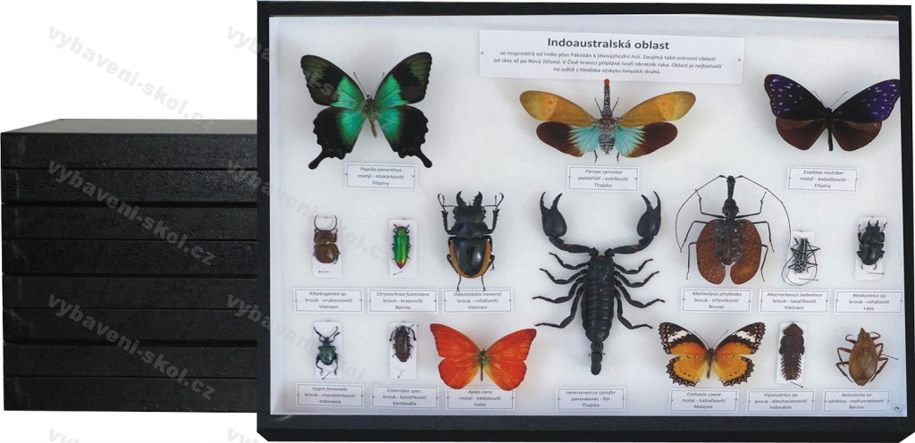 5 zasklených krabic po přibližně 14 exponátech. Motýli, brouci, pavouci, stonožky aj.