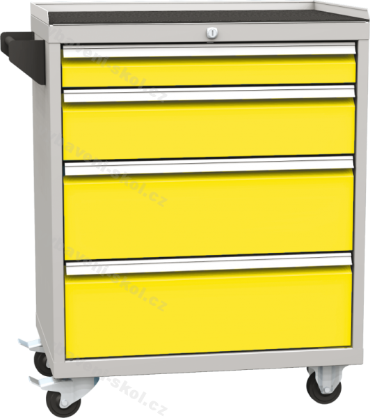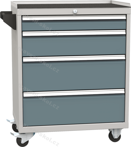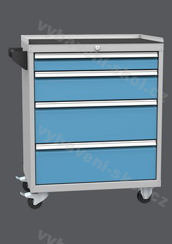 Profesionální servisní vozík je praktickou součástí všech dílen a výrobních pracovišť. Poskytuje rychlou orientaci v uloženém nářadí a jejich snadné přemísťování. Vozík tvoří odolná plechová samonosná konstrukce šedé barvy RAL, kterou doplňují 4 zásuvky s možností výběru barvy RAL se systémem blokace vysunutí více zásuvek najednou. Do zásuvek je možno pořídit dělící prvky DPV. Centrální zámek. Mobilitu montážního vozíku zajišťují pojezdová kolečka s brzdou. Nosnost korpusu 300 kg, nosnost zásuvek 80 kg.