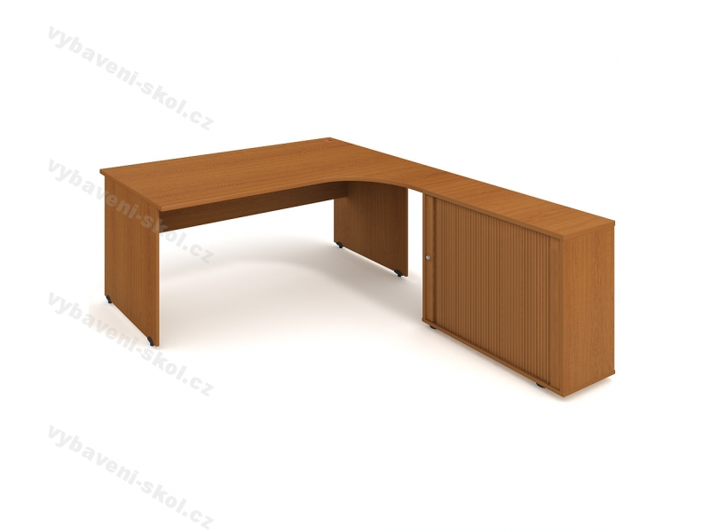 Nápadité provedení žaluziové skříně, která je součástí sestavy Gate GE 1800 HR L není jedinou předností tohoto produktu. Sestava je vyrobena z kvalitní laminátové dřevotřísky (lamino), která zajišťuje dlouhodobou životnost. Pracovní deska sestavy je ergonomicky tvarovaná vykrojená do oblouku, což umožňuje ideální využití pracovní plochy. Pracovní deska o síle 25 mm (ostatní prvky 18 mm) je opatřena hranou ABS o síle 2 mm, která ji chrání proti mechanickému poškození. Na horní desce je umístěna praktická průchodka, která slouží ke svedení kabelů od PC či osvětlení pod desku, kde lze kabeláž upevnit plastovými držáky. Hranou ABS jsou opatřeny také vnější a vnitřní strany nohou. Nohy stolu jsou vybaveny výškově nastavitelnou rektifikací, která umožňuje vyrovnat nerovnosti podlah až o 1,5 cm. Stabilitu stolu zajišťuje příčka, tzv. trnož (18 mm), která spojuje obě nohy. Sestavu je možné kombinovat s dalšími nábytkovými prvky díky jednoduchému spojovacímu systému, který je automaticky součástí každého prvku. Barevné provedení je možné zvolit v níže uvedeném vzorníku.