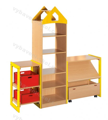Nábytková sestava složená z jednotlivých komponentů nábytkového programu MIKI PLUS. Korpusy a dvířka skříněk jsou vyrobeny z laminované dřevotřísky v několika dezénech o síle 18 mm, hrany jsou ošetřeny proti poškození 2 mm ABS hranou. Zásuvky jsou vyrobeny ze spárové bukové desky v několika barevných provedeních a jsou ošetřeny polyuretanovým lakem.