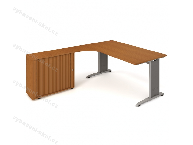 Ergonomicky tvarovaná pracovní deska vykrojená do oblouku sestavy Flex FE 1800 HR P zaručuje maximální využití pracovní plochy. Součástí této sestavy je uzavřená, uzamykatelná žaluziová skříň. Pracovní deska je vyrobena z lamina tloušťky 25 mm a je osazena ochrannou hranou ABS silnou 2 mm, díky které zabráníte nechtěnému poškození. Na pracovní ploše je umístěna praktická průchodka, která se postará o svedení kabelů pod pracovní desku, kde lze kabely uchytit plastovými držáky. Kabely lze dále vést kovovou nohou stolu opatřenou plastovým krytem, díky kterému nebudou kabely viditelné. Barevné provedení a design kovové nohy lze zvolit v níže uvedené nabídce. Plastová výplň je barvy antracitu. Kovové nohy jsou propojeny teleskopickým kanálem, díky němuž je stůl dokonale stabilní i bez pracovní desky. Kromě toho slouží kanál také jako elegantní úkryt pro vedení veškeré kabeláže Vašeho PC. Samozřejmostí je rektifikace u nohou, která umožňuje dorovnání stolu až o 15 mm, a zaručuje tak, že pracovní plocha bude vždy vodorovná. Při řazení pracovních stolů k sobě nabízí řada FLEX prvky s úsporným systémem tzv. řetězení. Jednoduchý spojovací systém (automatickou součástí každého prvku) umožňuje kombinovat sestavu s jinými nábytkovými prvky. Barevné provedení dřeva lze zvolit ve vzorníku.