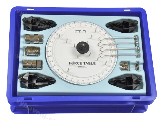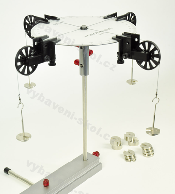 1 x silový stůl, na kvantitativní znázornění rozložení sil; kovová pracovní deska, D = 200 mm, natřená nabílo, s přesným dělením; v středu je axiální čep pro upevnění na stativ; na okraj desky se upevní až 4 vodící kladky v libovolném úhlu; na provázky, které jsou položené přes kladky, se zavěsí závaží