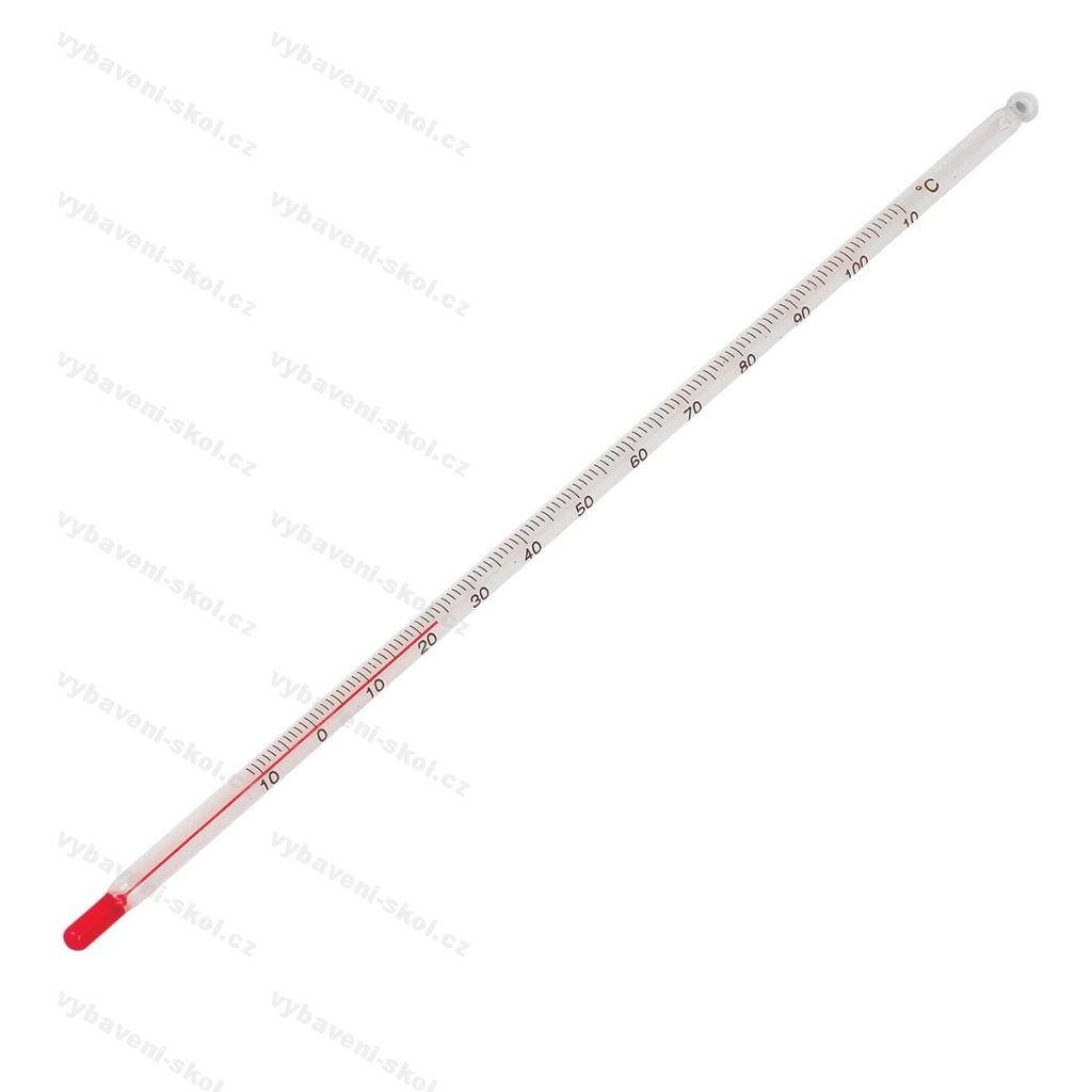 Graduovaný. Rozsah -10 °C až +110 °C, dělení po 1 °C. Červená speciální tekutina. Velikost 260 mm, průměr 6 mm. Plastový transparentní obal.