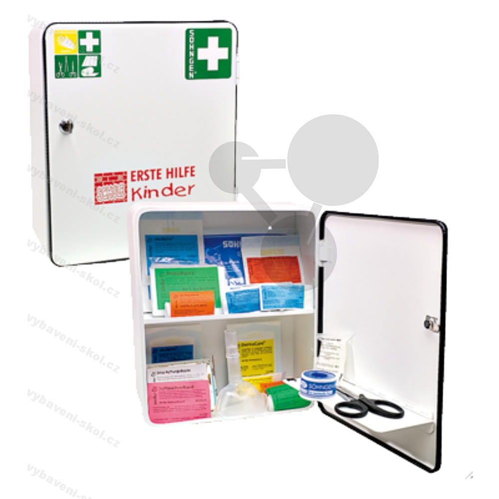 Školní lékárnička, skříňka, s obsahem dle ASR A4.3 (DIN 13157) plus přídavné vybavení pro školní děti všech věkových skupin, optimální pomoc zajišťují speciálně vyvinuté obvazové materiály v dětské velikosti při zohlednění specifických školních úrazů, 1 dvířka, pro pevnou nástěnnou montáž, uzamykatelná, výškově přestavitelná police, výklopná polička ve dveřích, bezpečnostní zámek se 2 klíči, zaoblené rohy a hrany, dveře se sraženými hranami, barva: bílá, materiál: ocelový plech.