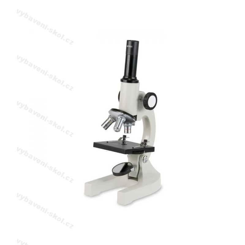 Žákovský monokulární mikroskop se sadou trvalých preparátů a základní sadou mikroskopického příslušenství.