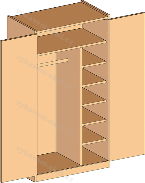 Šatní skříň vhodná nejen do mateřských školiček je vybavena volným úložným prostorem, ale také policemi, vše kryjí dvířka. Ta jsou dýhovaná, povrchově upravená (polomatným polyuretanovým lakem), nebo v provedení laminované dřevotřísky její barevnost je volitelná. Korpusy z LDT desek jsou silné 18 mm, olepené odolnou 2 mm hranou ABS.