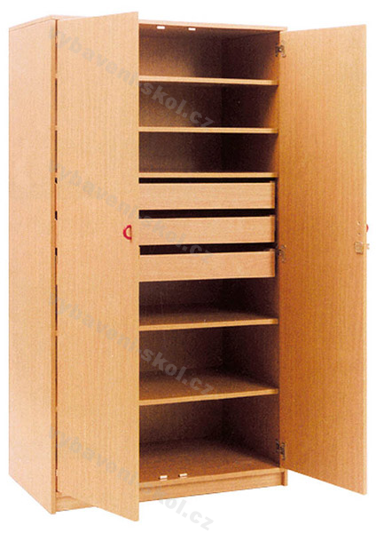 Skříň s uzamykatelnými dveřmi (čtyři police a tři zásuvky). Rozměr: 100x180,6x60 cm (Š x V x H).