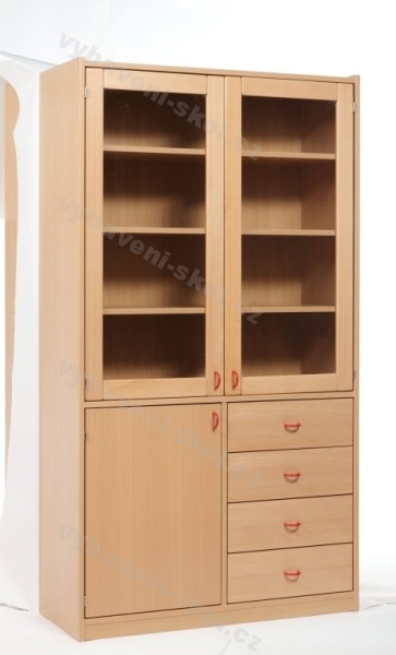 Skříň je určená pro vybavení interiérů mateřských škol. Laminové korpusy silné 18 mm chrání odolná 2 mm hrana ABS, která zabraňuje poškození. Dýhovaná dvířka i čela zásuvek s povrchovou úpravou polomatným polyuretanovým lakem nebo varianta laminované dřevotřísky o síle 18 mm, barevné provedení dvířek i čel zásuvek skříňky vybírejte ze vzorníku. Možnost zvolit typ úchytky.