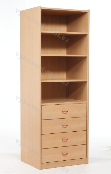 Skříňka zásuvková s vloženými policemi (čtyři zásuvky a tři police). Rozměr: 51x180,6x40 cm (Š x V x H).