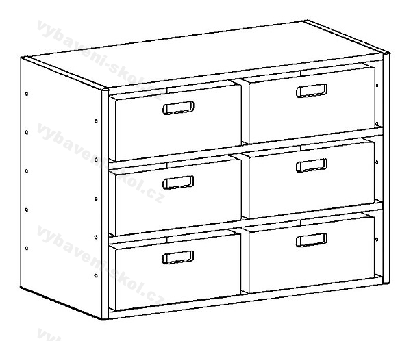 Skříňka bez soklu s dvěma policemi a šesti volnými zásuvkami. Rozměry: 80x57,5x40 cm (Š x V x H).