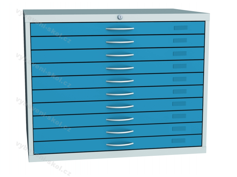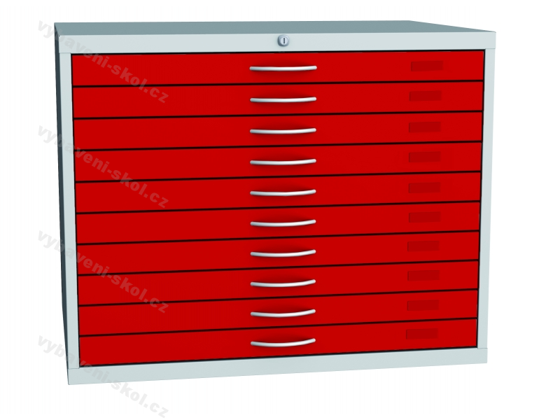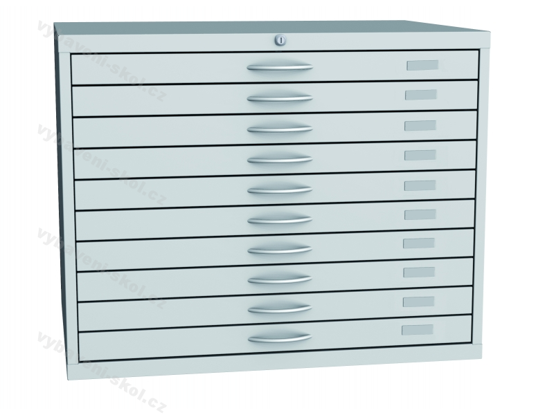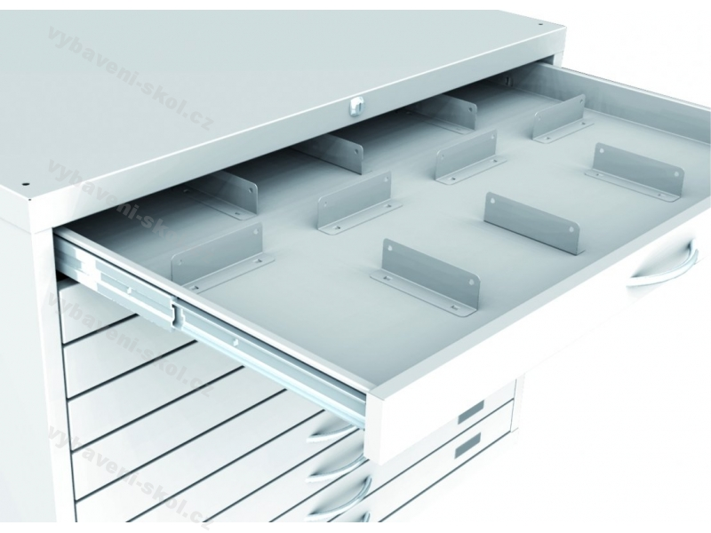 Skříň je určena pro uložení výkresů, map aj. Skříň se vyznačuje se masivní svařovanou konstrukcí v barvě RAL 7035. Zásuvky s možností výběru barvy RAL jsou vedeny teleskopickými výsuvy, jejich dna jsou opatřena otvory pro použití dělících příček, které umožňují rozdělení úložného prostoru až na sekce formátu A4. Uzamykání je řešeno cylindrickým zámkem s centrálním uzamykacím mechanismem, který je vybaven systémem blokace proti vysunutí více zásuvek. Dna zásuvek jsou opatřena otvory pro použití dělících příček, které umožňují rozdělení vnitřního prostoru zásuvek až na sekce formátu A4. Skříň má 10 x zásuvku A1. Zásuvky jsou vybaveny kuličkovými plnovýsuvy, mají vpředu přidržovač a vzadu krycí lištu proti rolování výkresů. Nosnost zásuvky 40 kg. Za příplatek je možné doplnit zásuvky o plastové štítky pro jmenovky. Také je možné osadit zásuvky dělícími přepážkami až na formát A4. V případě, že máte zájem o dělící přepážky, uveďte do poznámky počet zásuvek, u kterých si přejte přepážky objednat (cena níže je za dělící přepážky pro 1 zásuvku). Pro pohodlnější užívání je možné výkresovou skříň vybavit kovovým podstavcem z ocelových profilů. Výšku podstavce jsme schopni vyrobit dle přání zákazníka. Pokud máte zájem o kovový podstavec, uveďte tuto skutečnost do poznámky, bude Vám provedena cenová kalkulace.