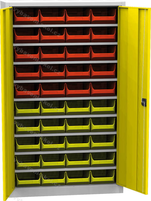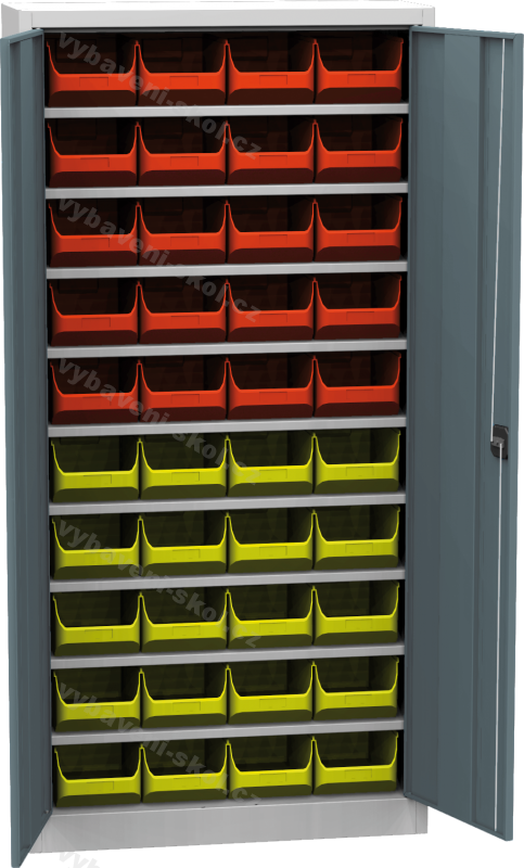 Snadné a systematické uložení různého pracovního materiálu poskytuje regálová zásobníková skříň. Ve stabilní ocelové konstrukci šedé barvy RAL, jsou usazeny pevné police výškově upravitelné po 25 mm s nosností 60 kg. Součástí zásobníkové dílenské skříně jsou plastové zásobníky dvou barev po 20ks nebo 20 a 25 ks dle rozměru plastových boxů pro pracovní nářadí i drobné součástky. Skříňové dvířka jsou v různých volitelných variantách a výběru barvy RAL a vnitřní vybavení skříně lze přizpůsobit požadavkům zákazníka. Nosnost korpusu 300 kg.