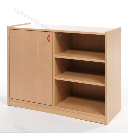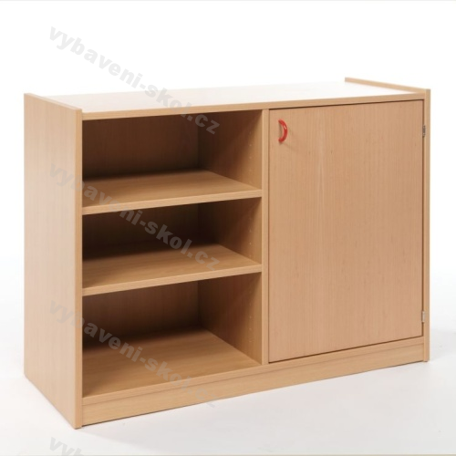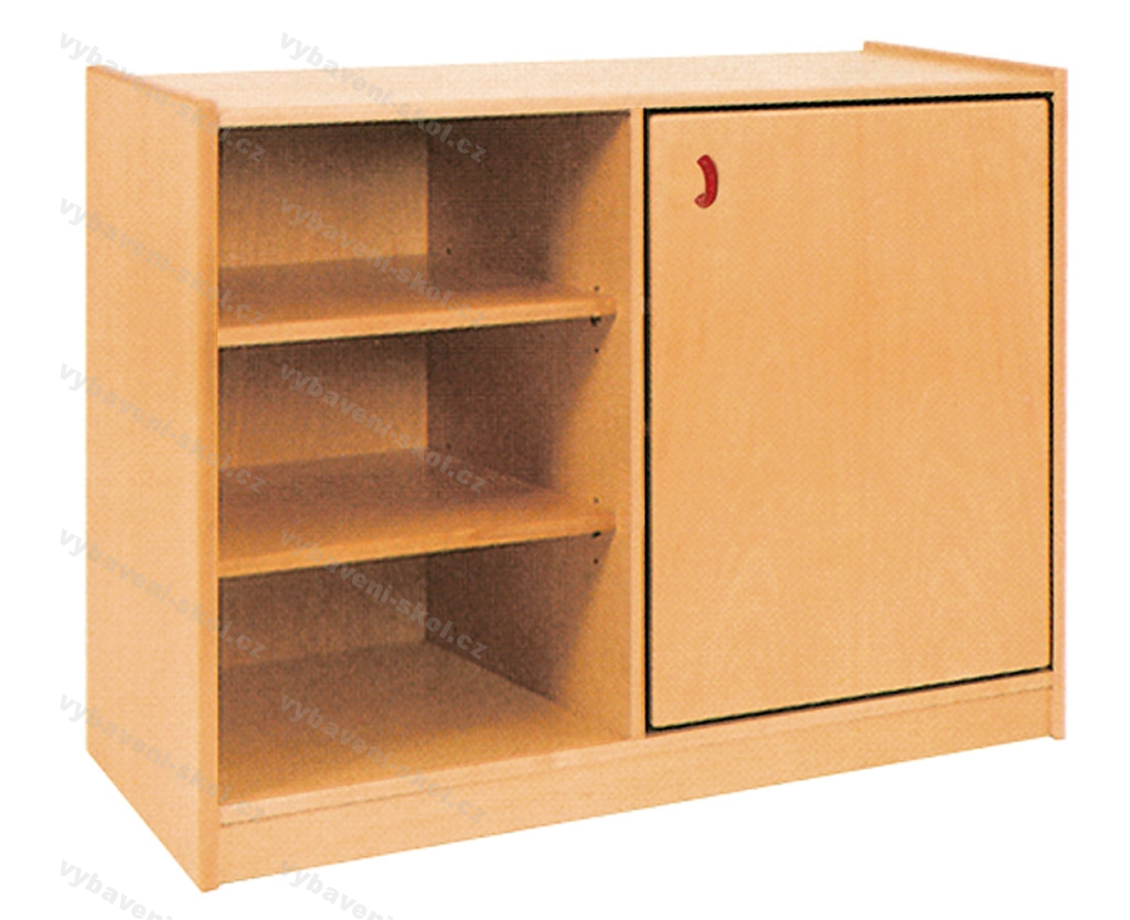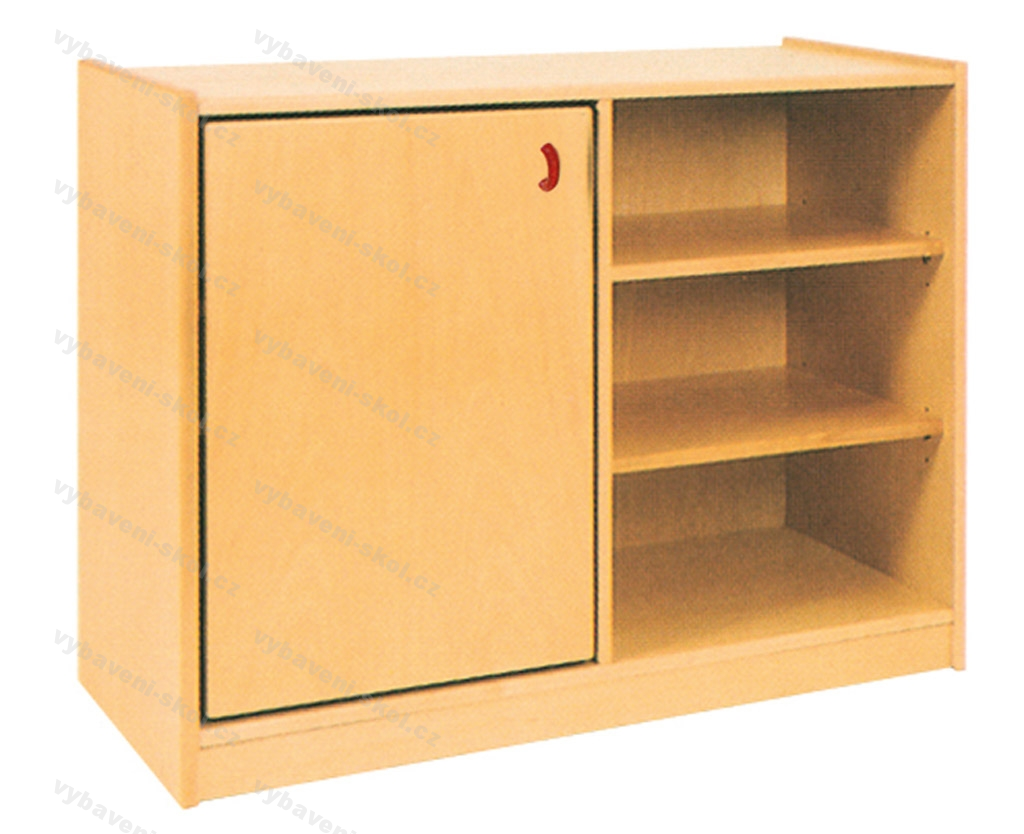 Skříňka slouží k uschování hraček a jiných předmětů. Levá část je kryta dvířky, v pravé části se nacházejí tři police. Korpusy jsou laminové dřevotřísky, silné 18 mm, chráněny 2 mm hranou ABS s možností výběru dezénu. Bukové, dýhované dvířka s povrchovou úpravou polomatným polyuretanovým lakem nebo dvířka z laminované 18 mm dřevotřísky s možností výběru dezénu. Dvířka jsou opatřeny úchytkou s možností volby typu.