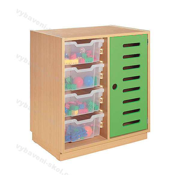 Kombinovaný úložný prostor nabízí praktická nízká dětská skříňka. Úložný systém řeší čtyři velké plastové zásuvky a dvě poličky kryté plastovými dvířky s otvory. Barevné provedení zásuvek i dvířek je možno volit dle vzorníku. Korpus skříňky je vyroben z oboustranně laminované dřevotřísky k výběru různé dezény o síle (18 mm) chráněné před poškozením 2 mm ABS hranou.