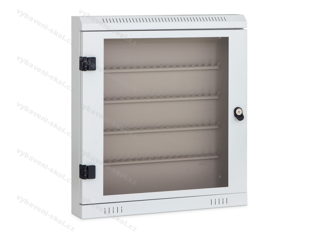Kovová úložná skříňka z ocelového plechu o síle 0,8 mm s prosklenými dveřmi. Skříňka je vybavena na sto háčky na klíče. 67x62x10,5 cm (VxŠxH).