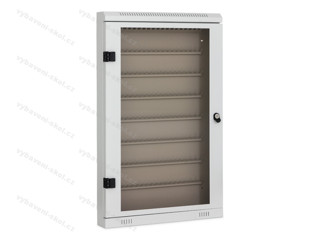 Kovová úložná skříňka z ocelového plechu o síle 0,8 mm s prosklenými dveřmi. Skříňka je vybavena na sto šedesáti háčky na klíče. 92x62x10,5 cm (VxŠxH).