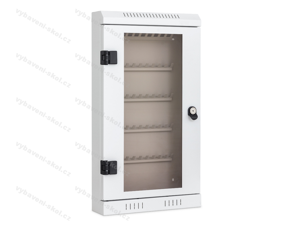 Kovová úložná skříňka z ocelového plechu o síle 0,8 mm s prosklenými dveřmi. Skříňka je vybavena na padesáti háčky na klíče. 67x37x10,5 cm (VxŠxH).
