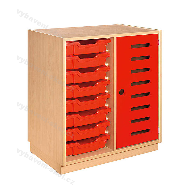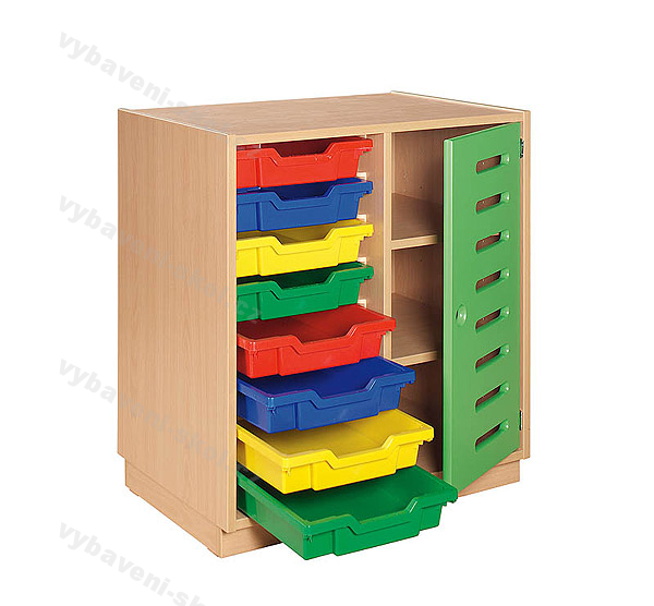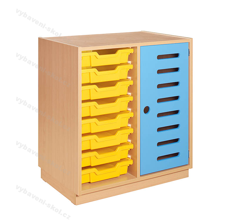 Barevná moderní dětská skříňka k uložení hraček, knížek, společenských her. Vnitřní prostor dvousloupcové skříňky vyplňuje osm odolných plastových zásuvek (barvy viz vzorník) a dvě poličky kryté plastovými dvířky s otvory (barvy viz vzorník). Skříňka je vyrobena laminované dřevotřísky s výběrem dezénu o síle 18 mm a odolnost proti poškození zajišťuje 2 mm ABS hrana.