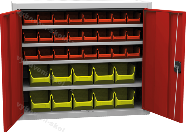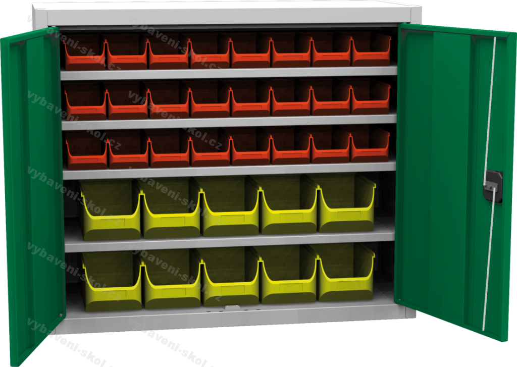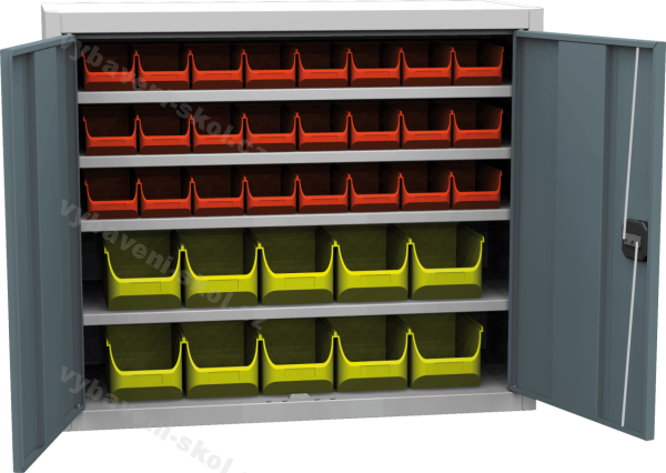 Efektivní a systematickou možnost uskladnění různého materiálu poskytuje nízká zásobníková dílenská skříňka. Tvoří ji stabilní ocelová konstrukce šedé barvy RAL s dvoukřídlými dveřmi s možností výběru dvířek a různých barevných kombinací v barvě RAL, vnitřní prostor je vybaven pevnými policemi. Police jsou výškově stavitelné po 25 mm 4 ks s nosností 60 kg a s plastovými zásobníky na pracovní nářadí a drobné součástky. Vnitřní vybavení skříně je možno přizpůsobit požadavkům zákazníka. Zásobníkové dílenské skříně se uzamykají cylindrickým zámkem BURG C5 s dvoubodovým mechanismem. Zámek má 2000 kombinací (možnost dodání systému centrálního klíče). Nosnost korpusu cca 300 kg.