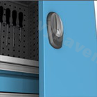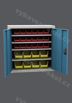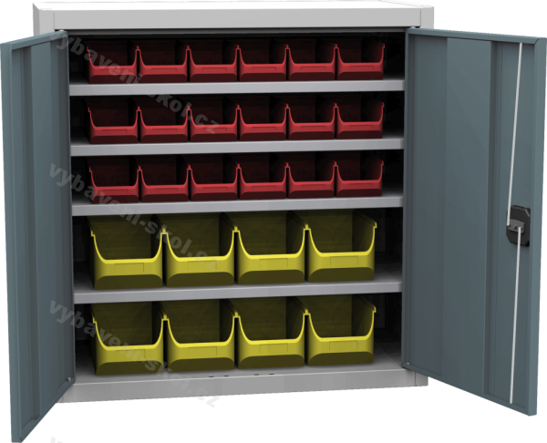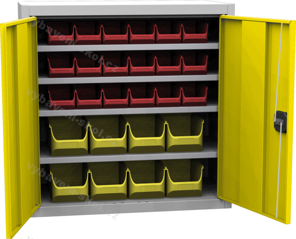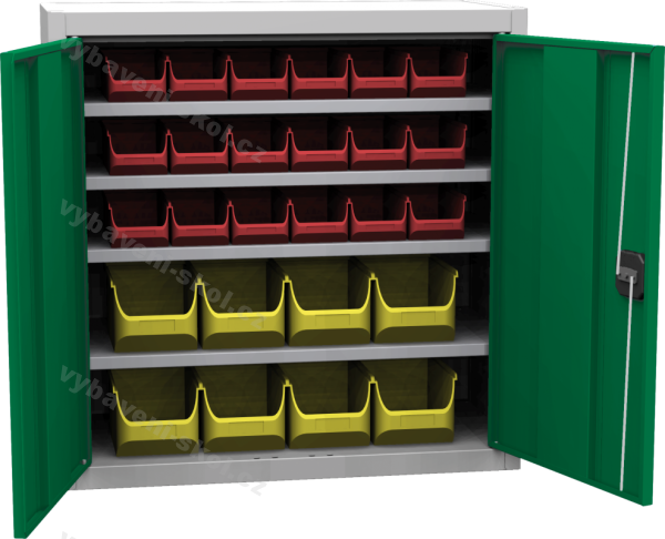 Efektivní a systematickou možnost uskladnění různého materiálu poskytuje nízká zásobníková dílenská skříňka. Tvoří ji stabilní ocelová konstrukce šedé barvy RAL s dvoukřídlými dveřmi v různých možnostech volitelnosti typu dvířek a širokého výběru barvy RAL, vnitřní prostor je vybaven 4 pevnými policemi. Police jsou výškově stavitelné po 25 mm s nosností 60 kg a s plastovými zásobníky na pracovní nářadí a drobné součástky. Vnitřní vybavení skříně je možno přizpůsobit požadavkům zákazníka. Zásobníkové dílenské skříně se uzamykají cylindrickým zámkem BURG C5 s dvoubodovým mechanismem. Zámek má 2000 kombinací (možnost dodání systému centrálního klíče). Nosnost korpusu cca 300 kg.
