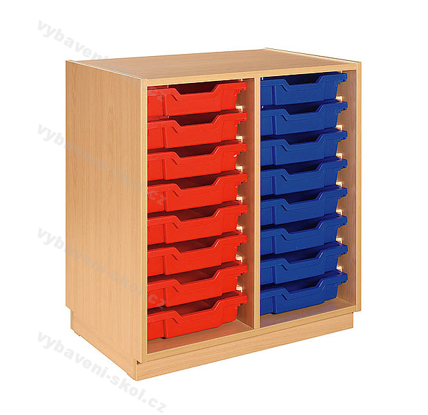 Otevřená dvousloupcová skříňka s plastovými zásuvkami. Korpus skříňky je vyroben z oboustranně laminované dřevotřísky s možností výběru dezénu o síle 18 mm, proti poškození je chrání 2 mm ABS hrana. Vnitřní prostor skříňky vyplňuje šestnáct plastových zásuvek (barvu lze volit).