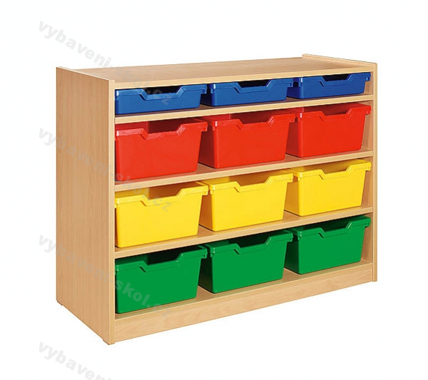 Skříňka s třemi policemi a plastovými zásuvkami (devět zásuvek double a tři zásuvky single). Rozměr: 100x75x40 cm (Š x V x H).