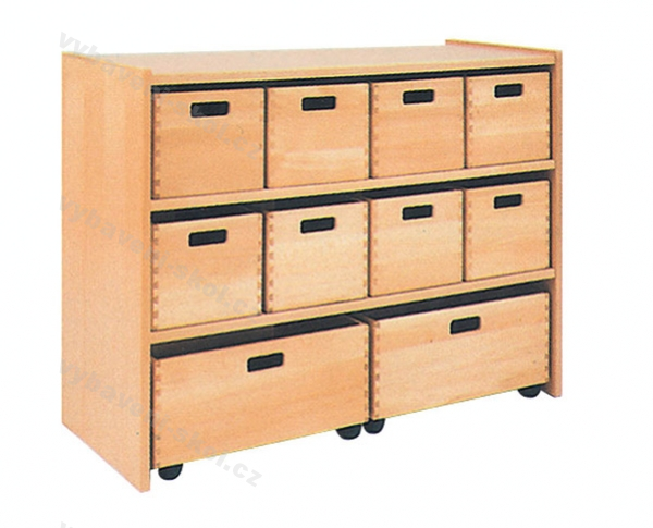 Kvalitní zásuvková skříň. Osm menších zásuvek a dvě hluboké zásuvky umístěné na kolečkách poskytují dostatek úložného prostoru pro drobné i větší dětské hračky. Vyrobeny jsou z bukové spárovky, jejíž povrch prošel úpravou polyuretanovým lakem (polomatný, v několika barevných odstínech). Oboustranně laminované dřevotřískové desky, z nichž jsou tvořeny korpusy, jsou silné 18 mm a chráněné 2 mm ABS hranou. V několika dezénech k výběru.