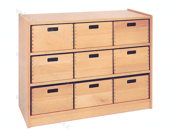Skříňka je opatřena devíti zásuvkami, které poskytují potřebný úložný prostor. Korpusy jsou z laminové (18 mm) dřevotřísky k výběru z několika dezénů, chráněné 2 mm ABS hranou. Zásuvky jsou z masivní bukové spárovky a povrchovou úpravou polomatným polyuretanovým lakem, v nabídce různé dezény.