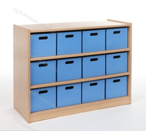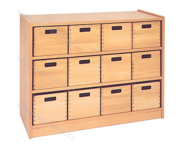 Dětská skříňka s dvanácti zásuvkami pro uložení hraček a drobných předmětů. Korpusy jsou z oboustranně laminované dřevotřísky silné 18 mm, chráněné 2 mm hranou ABS odolnou vůči poničení k výběru z dezénu buk, javor, bříza a bílá. Zásuvky z masivní bukové spárovky lze objednat v několika barevných odstínech (viz vzorník), jejich povrch je upraven polomatným polyuretanovým lakem.